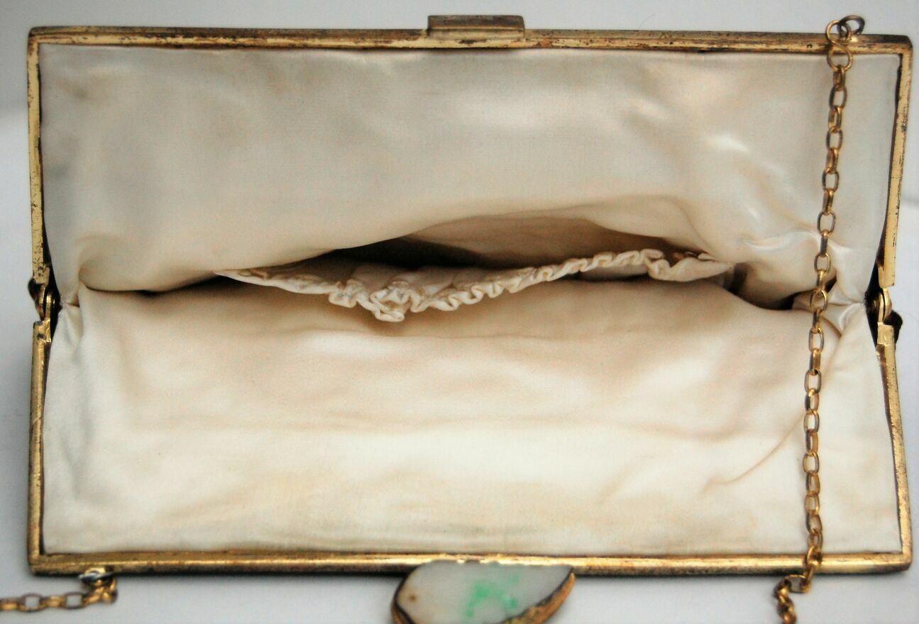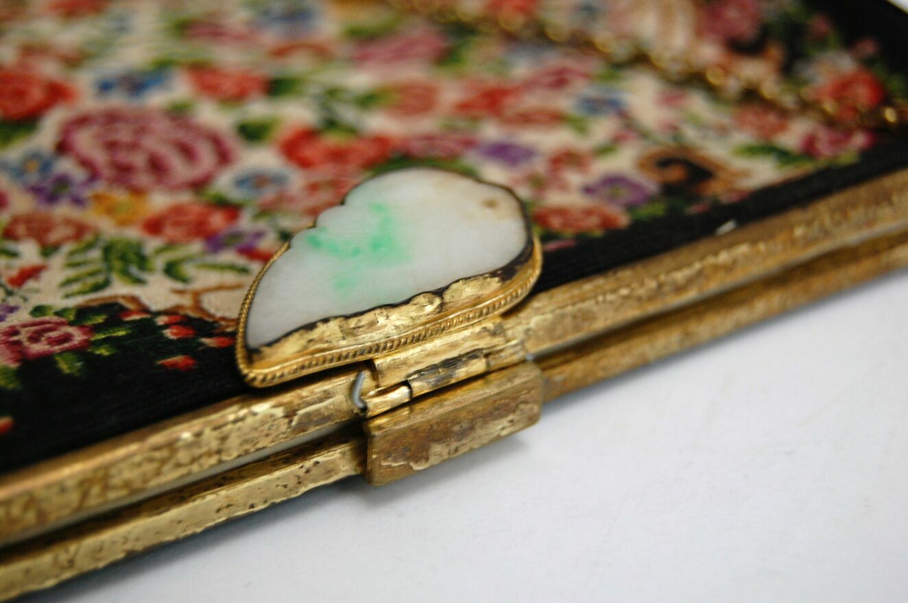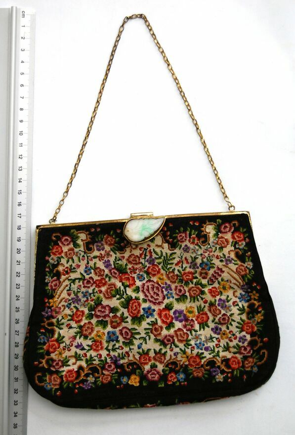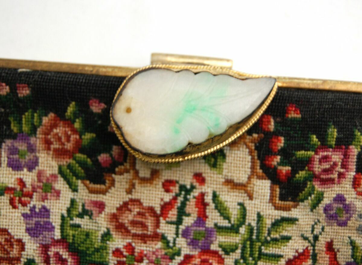 Przepiękna gobelinowa torebka do ręki, perełka vintage z Paryża. Torebka ma mosiężne okucia, łańcuszek, pokryte dodatkowo złotą powłoką, miejscami przetartą. Zapięcie jest wykonane z biało-zielonego z jadeitu - rzeźbionego listka. Wnętrze jest atłasowe, jasnobeżowe (czyste). Stan zachowania bardzo dobry.Wymiary: