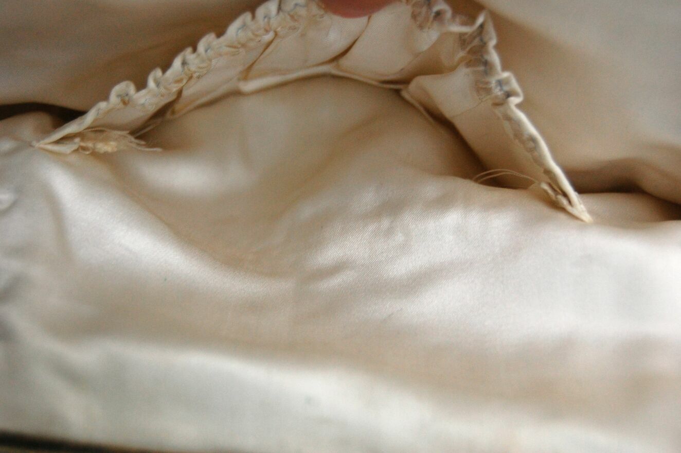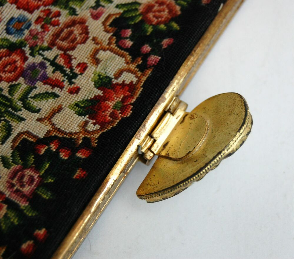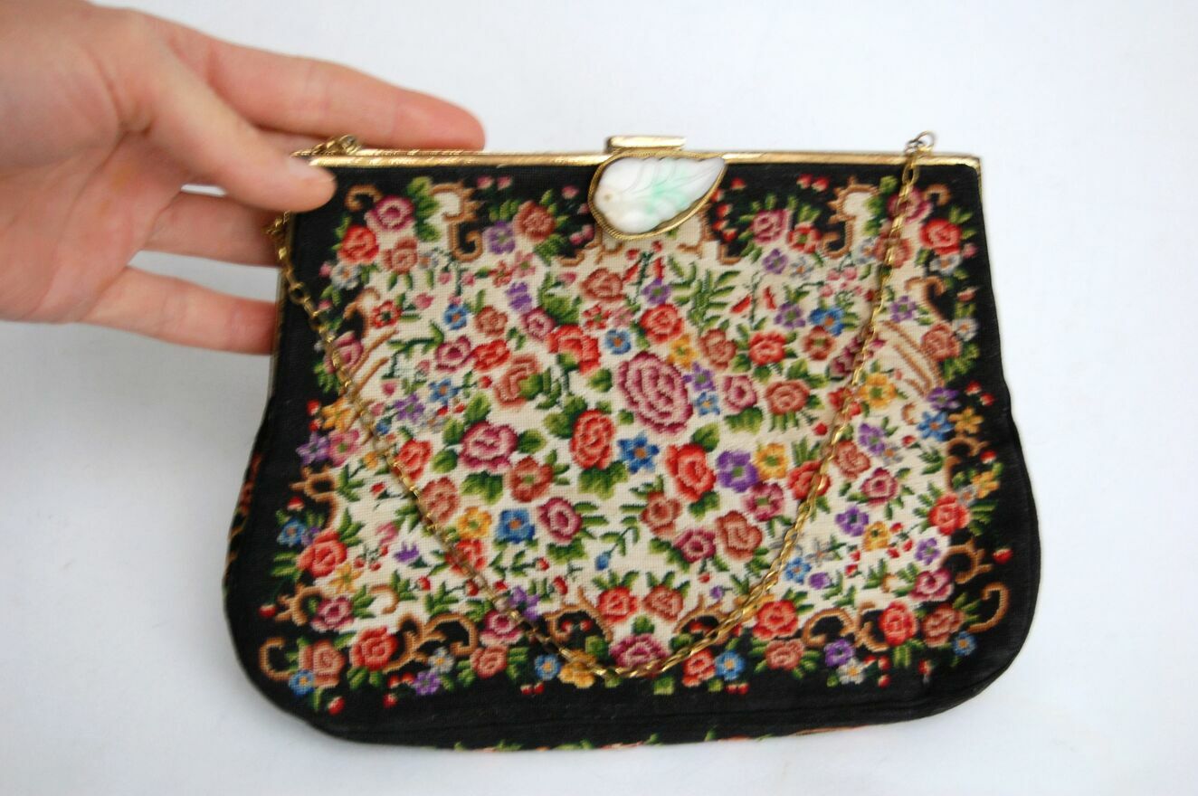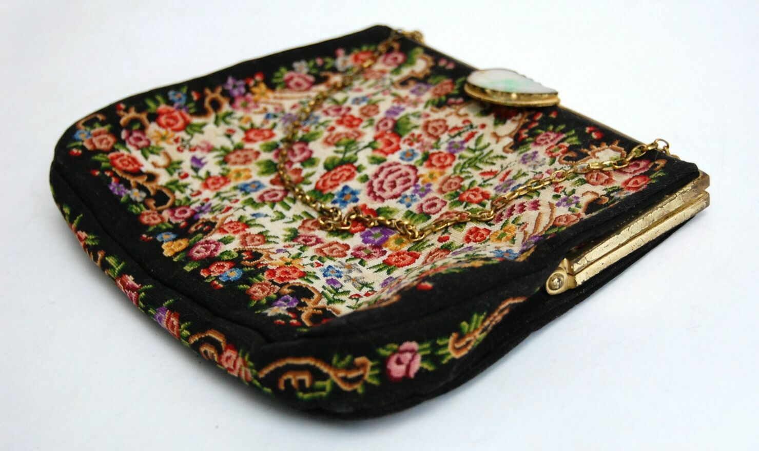 Przepiękna gobelinowa torebka do ręki, perełka vintage z Paryża. Torebka ma mosiężne okucia, łańcuszek, pokryte dodatkowo złotą powłoką, miejscami przetartą. Zapięcie jest wykonane z biało-zielonego z jadeitu - rzeźbionego listka. Wnętrze jest atłasowe, jasnobeżowe (czyste). Stan zachowania bardzo dobry.Wymiary: