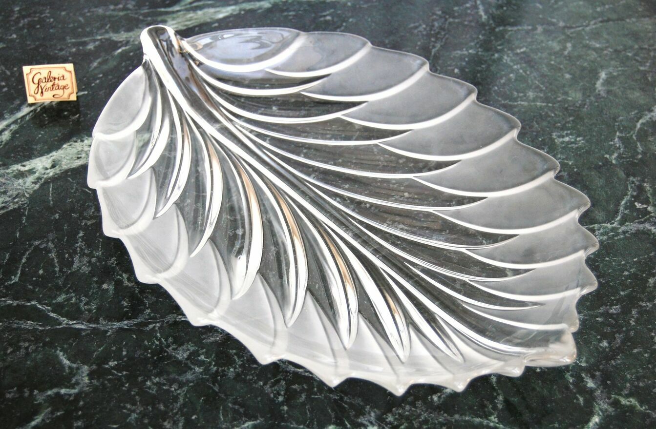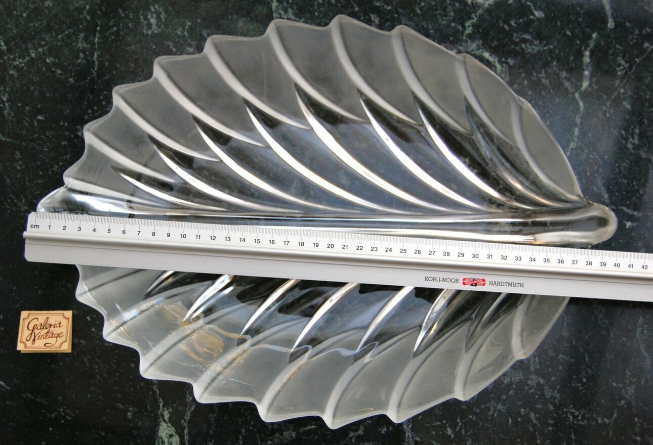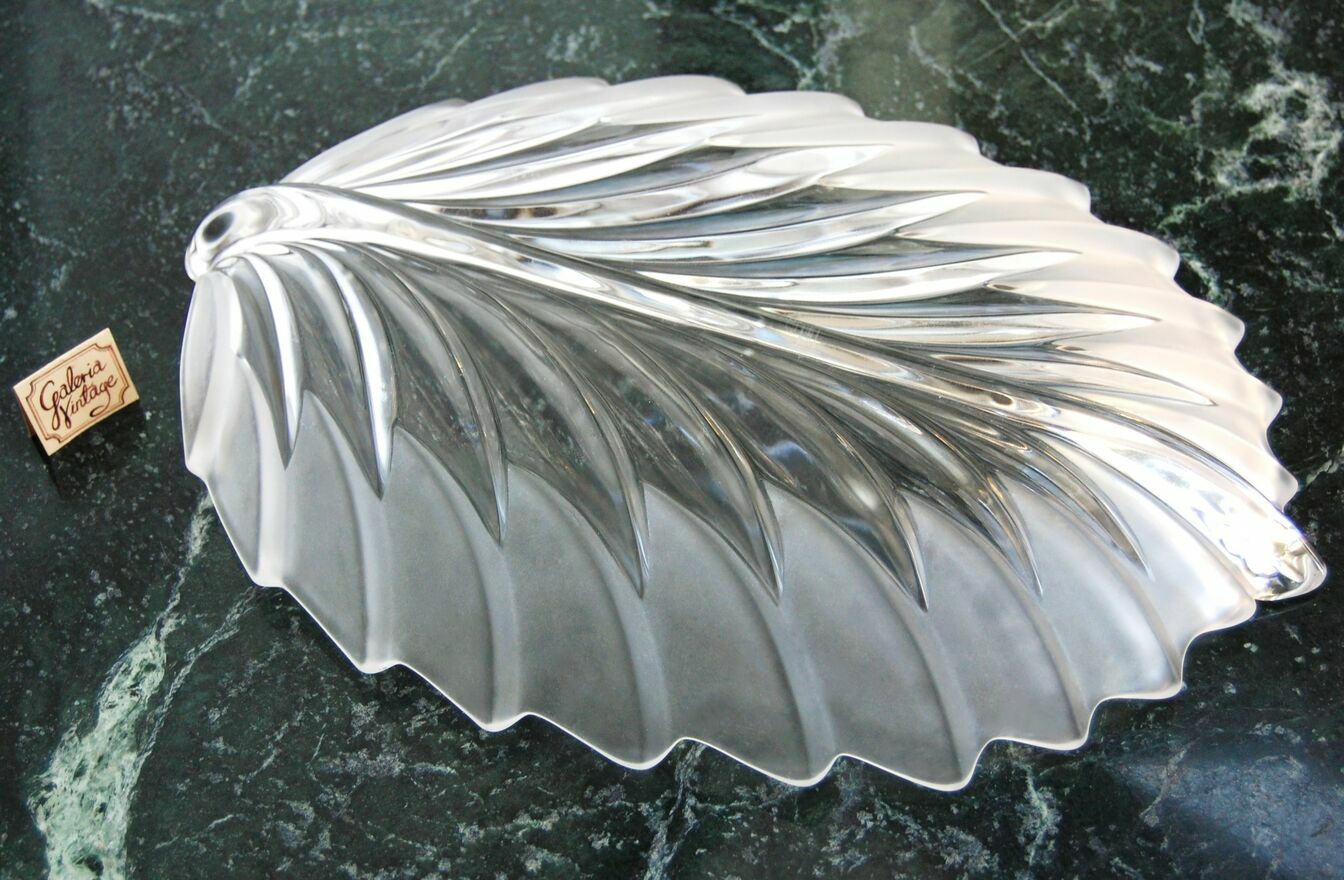 Duża, pojemna, kryształowa patera vintage w kształcie liścia. Marka Walther Glas, model Barca. Przeznaczenie: do serwowania owoców, ciasta. Patera jest wykonana z masywnego, lśniącego szkła kryształowego z brzegami o matowo-satynowej fakturze mrożonego kryształu. Design jest klasyczny, elegancki, ponadczasowy. Doskonały stan zachowania: brak śladów użytkowania, brak uszkodzeń.Wymiary: