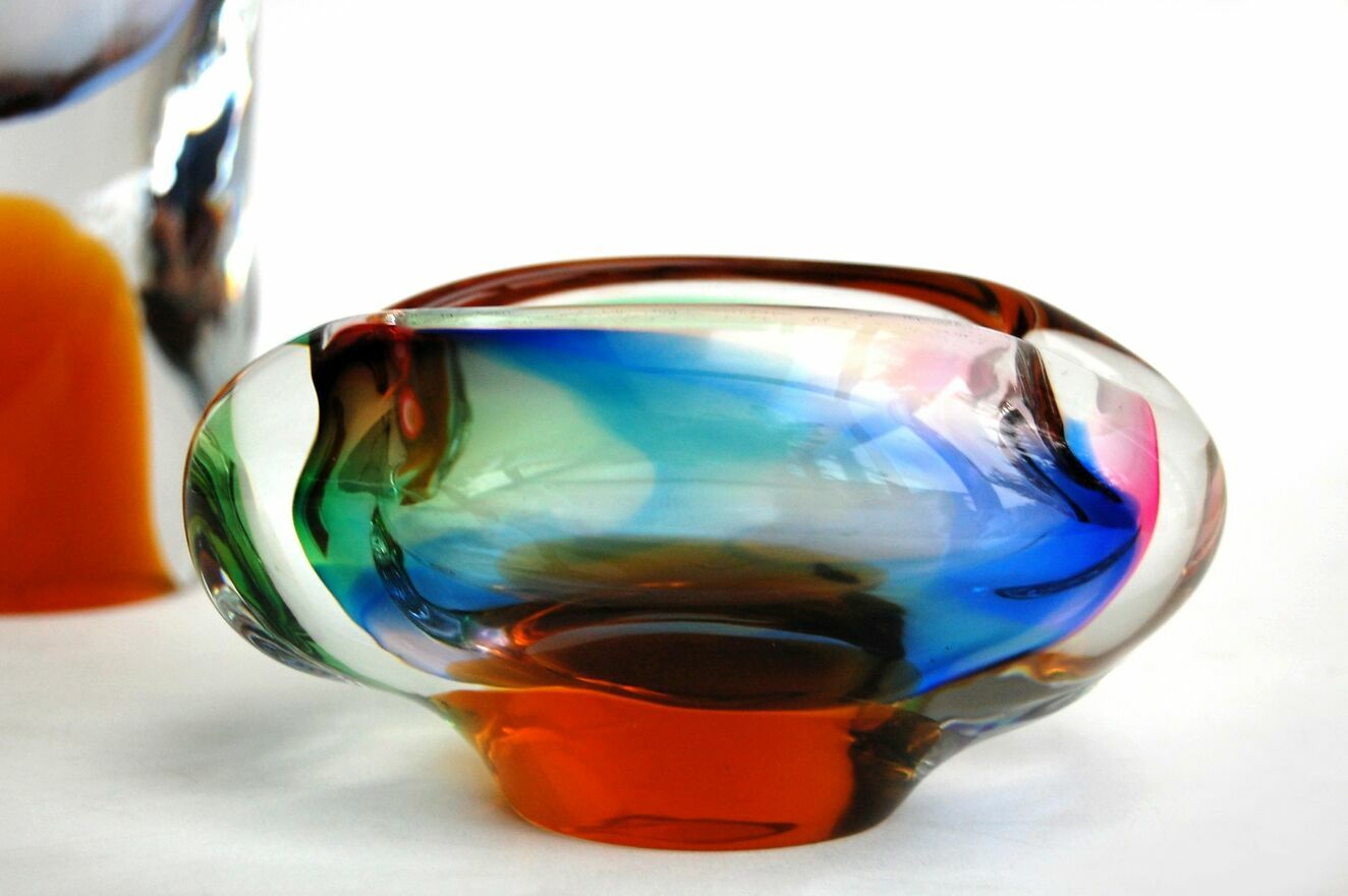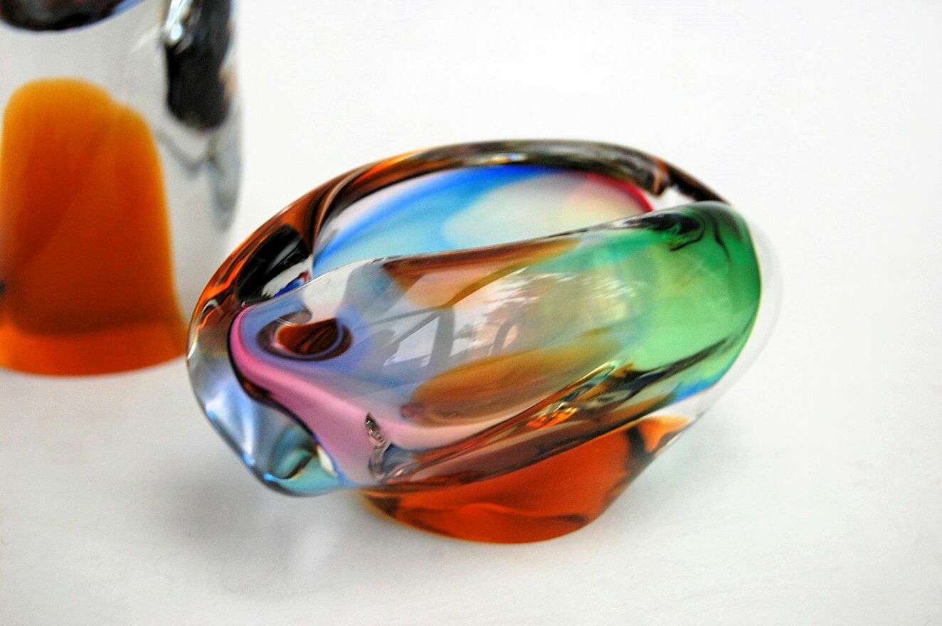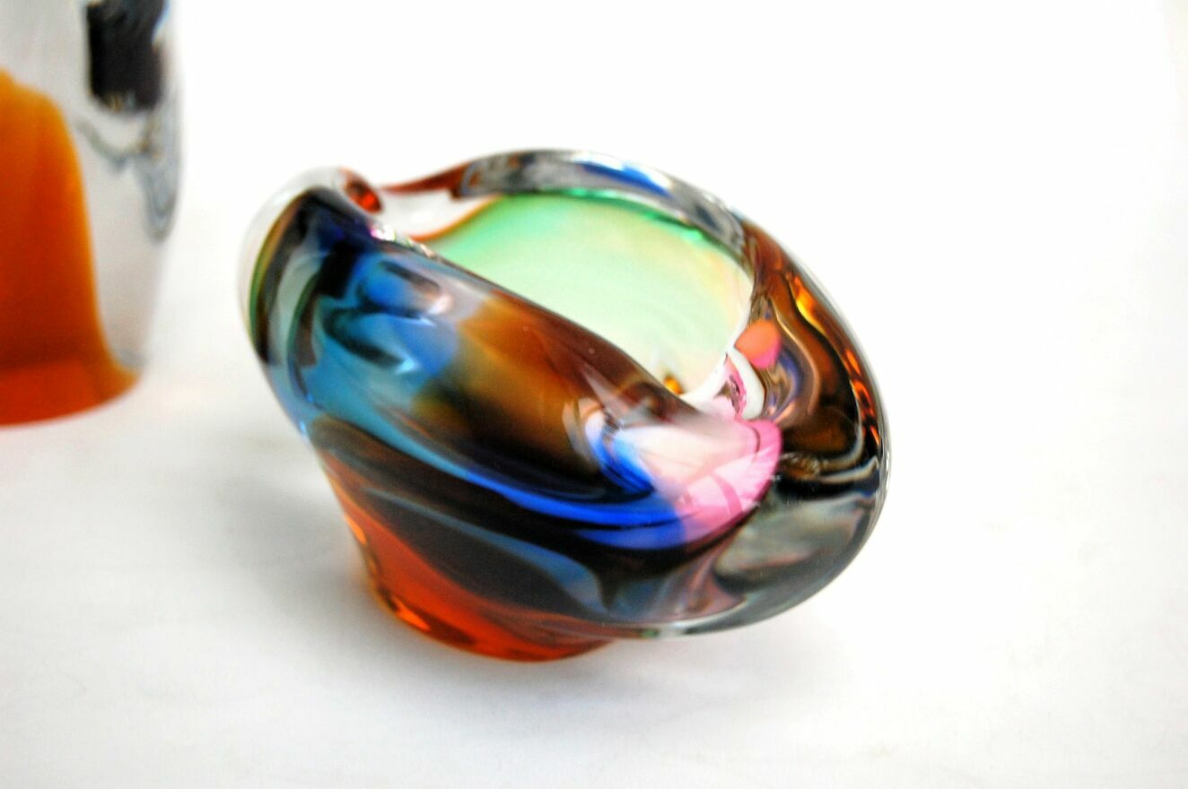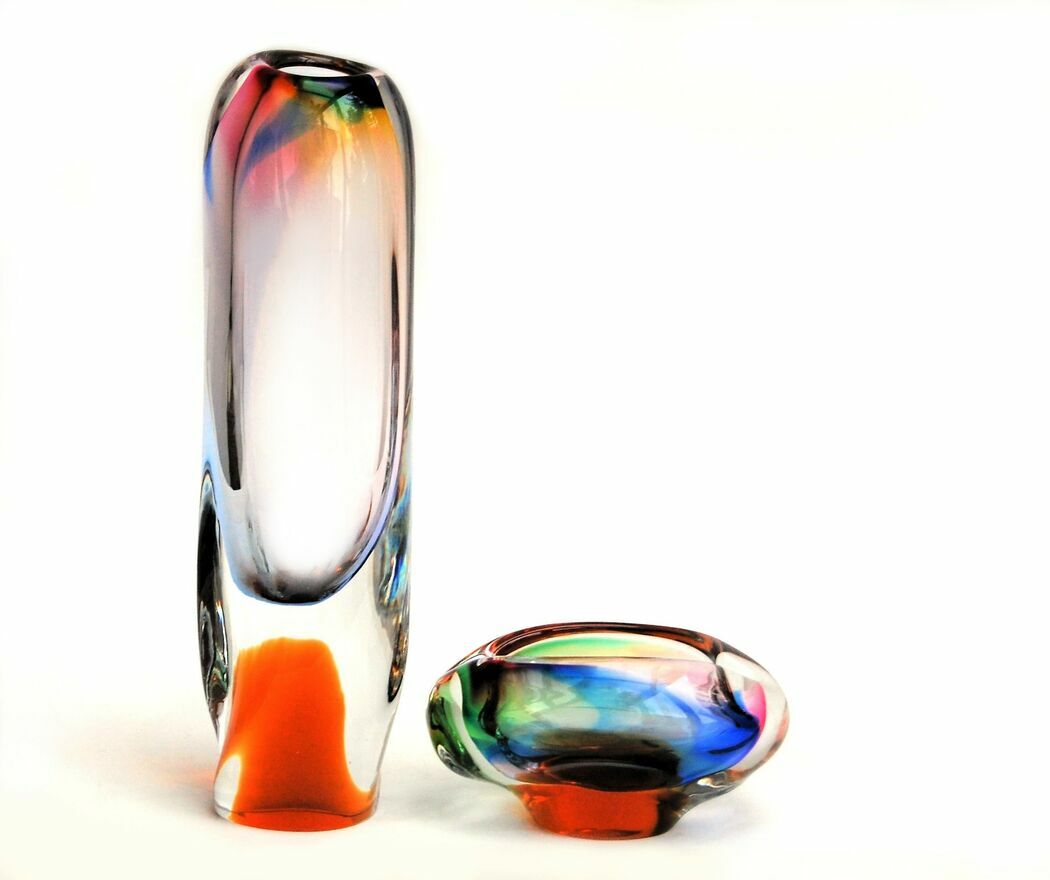 Wazon i popielniczka, Bohemia, Czechy. Przepiękne, rzadko spotykane przedmioty z ręcznie formowanego i barwionego w masie, grubego, masywnego szkła kryształowego. Wazon i popielniczka stanowią komplet, mają organiczną formę i fantastyczne zestawienie kolorów: pomarańczowy, żółty, różowy, niebieski (głęboki błękit ultramaryna), zielony. W zależności od sposobu ustawienia przedmiotu, kolory nakładają się na siebie i odbijają, "poruszają się" w nieregularnych bryłach szkła. Przedmioty były przechowywane, są nieużywane. Jedynie na podstawach jest kilka rys (pokazane na zdjęciach). Cena dotyczy kompletu.CENA JEST OSTATECZNA.
