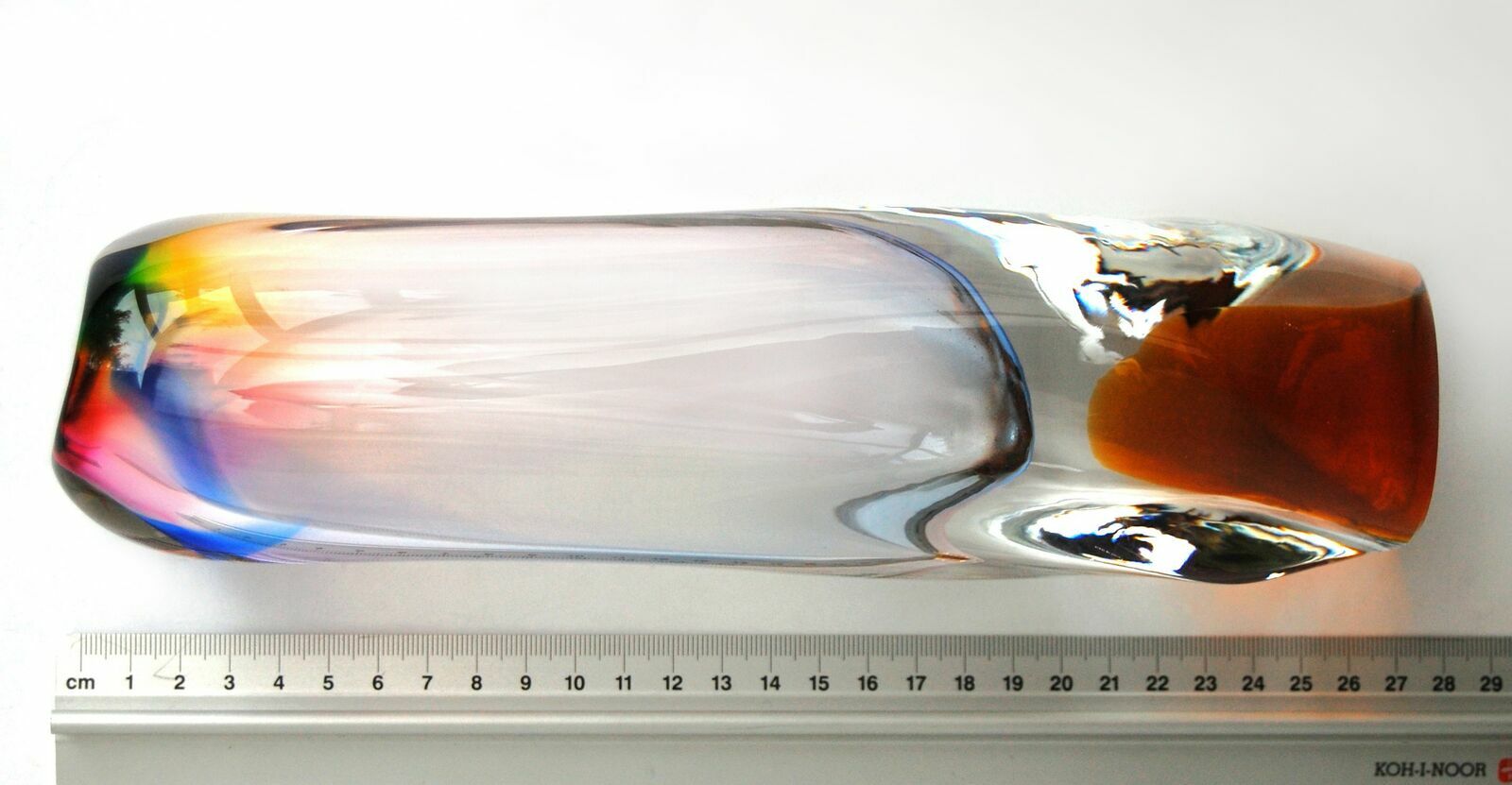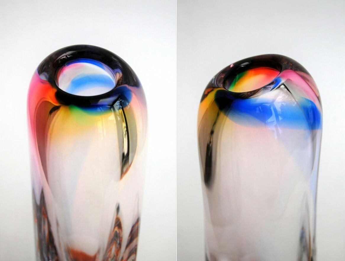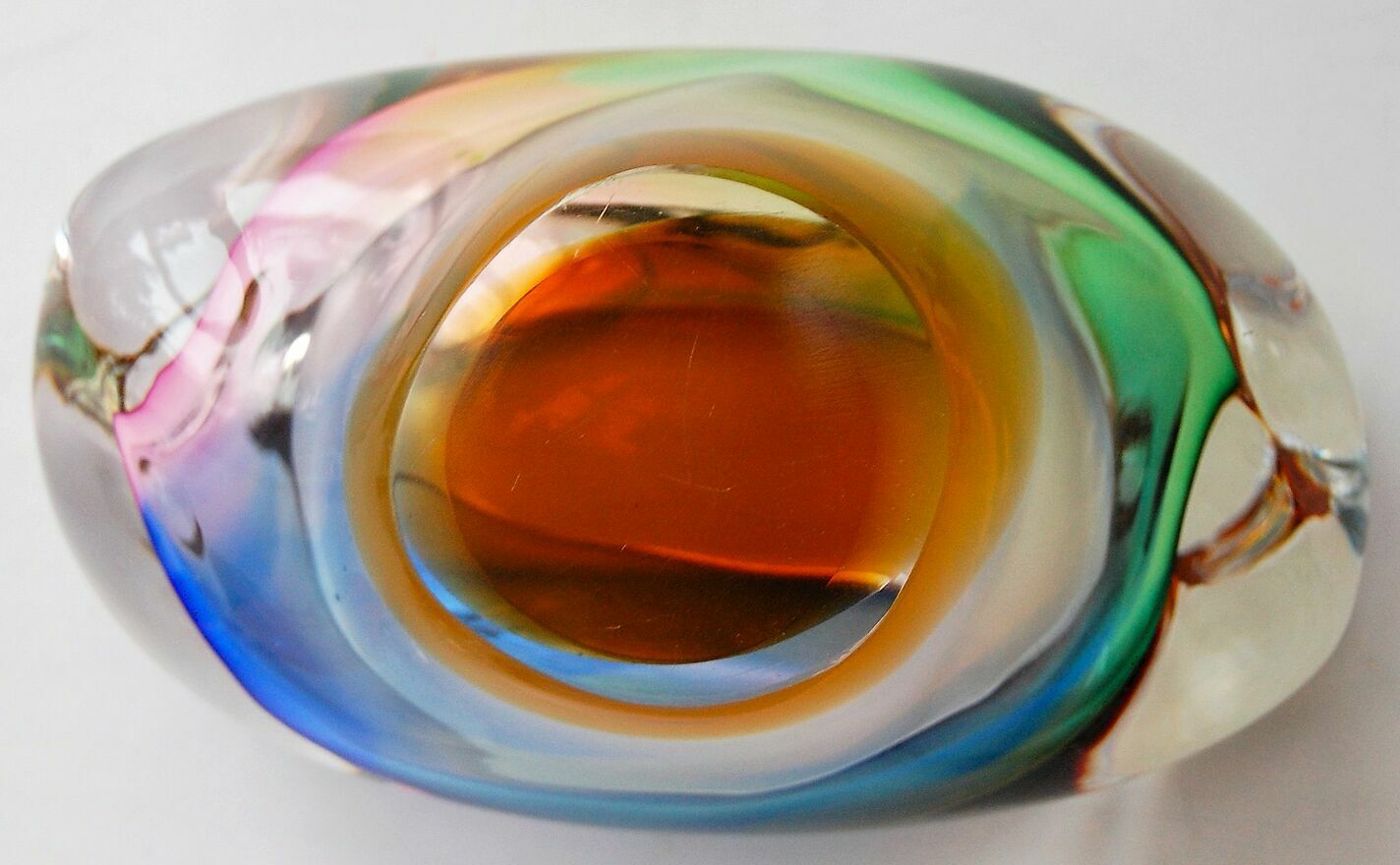Wazon i popielniczka, Bohemia, Czechy. Przepiękne, rzadko spotykane przedmioty z ręcznie formowanego i barwionego w masie, grubego, masywnego szkła kryształowego. Wazon i popielniczka stanowią komplet, mają organiczną formę i fantastyczne zestawienie kolorów: pomarańczowy, żółty, różowy, niebieski (głęboki błękit ultramaryna), zielony. W zależności od sposobu ustawienia przedmiotu, kolory nakładają się na siebie i odbijają, "poruszają się" w nieregularnych bryłach szkła. Przedmioty były przechowywane, są nieużywane. Jedynie na podstawach jest kilka rys (pokazane na zdjęciach). Cena dotyczy kompletu.CENA JEST OSTATECZNA.