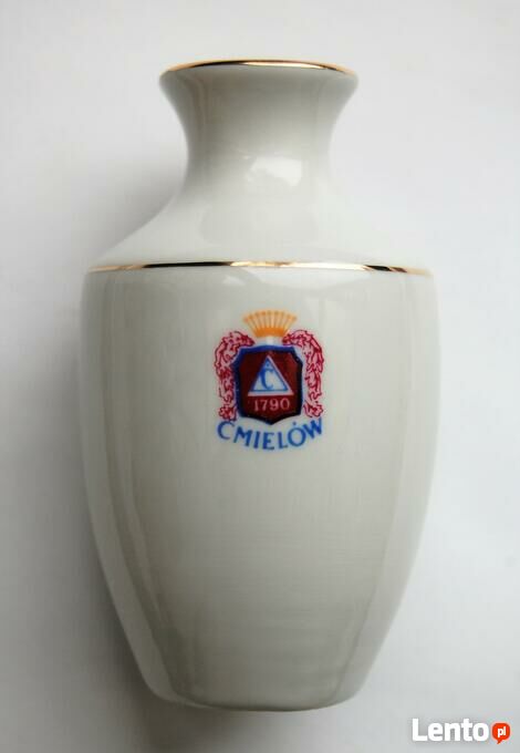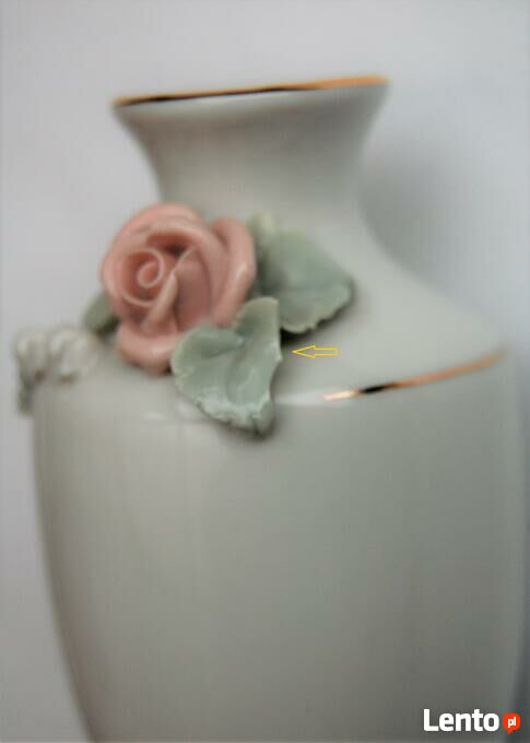 Wazonik z reliefem z różą i konwalią, porcelana Ćmielów. Datowanie: II połowa XX wieku. Sygnowany. Kolorystyka jasna, pastelowa: biel (porcelana), różowy, szarozielony. Kwiaty są ręcznie wymodelowane. Wazon zdobią dwa pasma pozłoty w górnej części. Stan zachowania bardzo dobry, bez zarysowań, z małym uszczerbkiem na krawędzi dolnego listka róży (pokazany strzałką na zdjęciu ze zbliżeniem).Wymiary (wysokość x średnica w najszerszym miejscu x średnica otworu): 9,2 x 5,5 x ok.1,7 (cm).