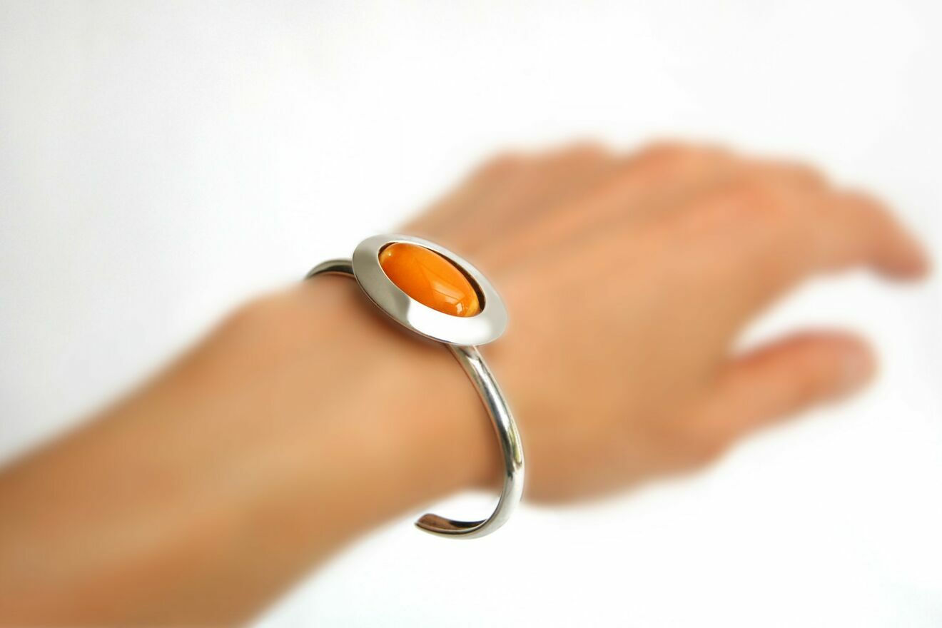 Bransoletka (średnica wewnętrzna x wysokość kaboszonu w oprawie/szerokość/głębokość): 6,3 x 3,5/2,5/0,8 cm.