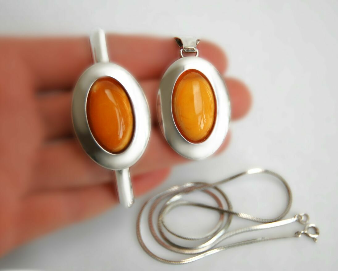 Piękny, elegancki komplet biżuterii z naturalnym bursztynem bałtyckim o barwie miodowomlecznej, żółtej, ze srebra próby 925. Kaboszony bursztynu w owalnej oprawie mają taki sam rozmiar. W komplecie z wisiorem jest łańcuszek ze srebra próby 925 typu żmijka o przekroju kwadratu. Stan zachowania bardzo dobry.Wymiary: