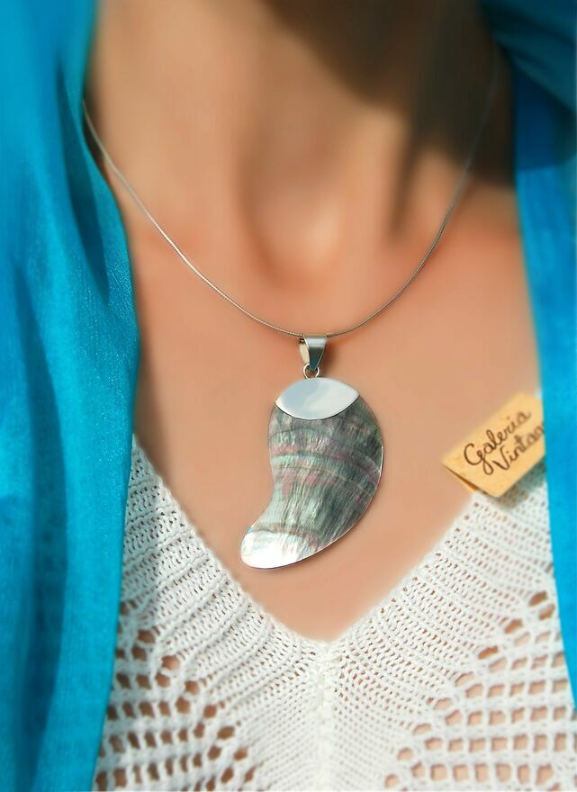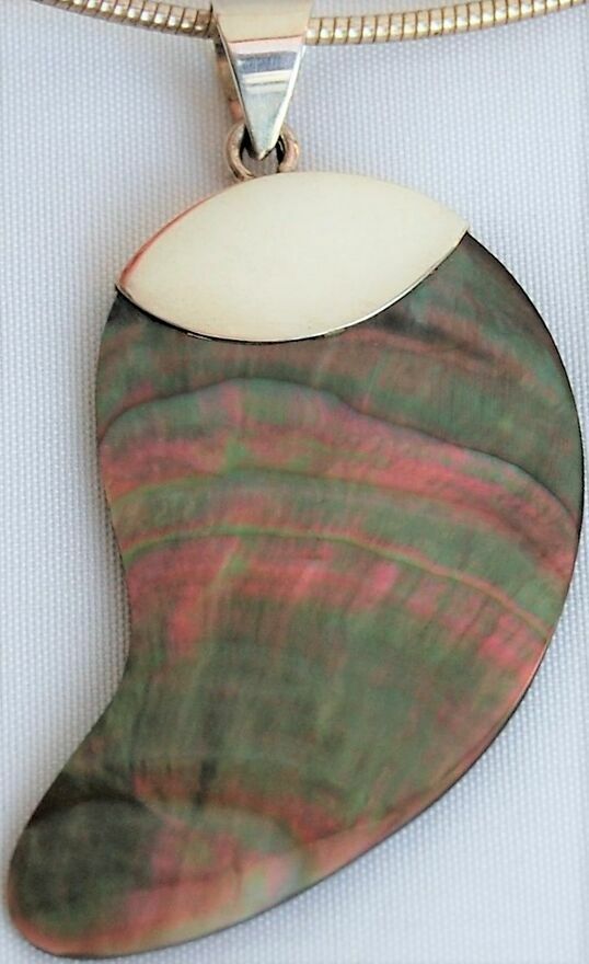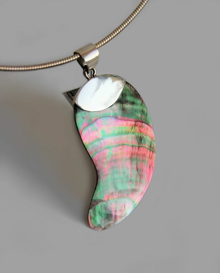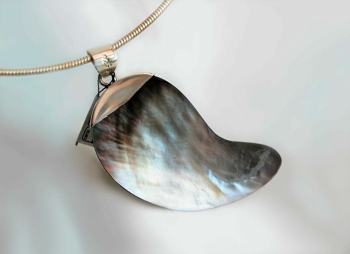 Wisior w stylu etnicznym, boho w kształcie kła z masy perłowej i srebra próby 925. Marka Fako. Masa: 6,8 g. Punce są wybite na zawieszce. Masa perłowa w kolorze srebrzystoszarym (ciemniejszy odcień szarości) mieni się odcieniami różu i zieleni. Stan: nowy z etykietą.Wymiary (wysokość całkowita x szerokość x głębokość mierzona na środku x średnica otworu zawieszki): 6,3 x 3 x 0,1 x 0,65 (cm).