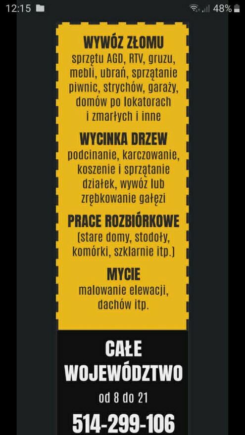 Zapraszamy do skorzystania z naszych usług:*Wywóz złomu, sprzętu AGD, RTV, gruzu, mebli, ubrań, sprzątanie piwnic, strychów, garaży, domów po lokatorach i zmarłych i inne. *Wycinka drzew, podcinanie, karczowanie, koszenie i sprzątanie działek, wywóz lub zrębkowanie gałęzi, frezezowanie pni.