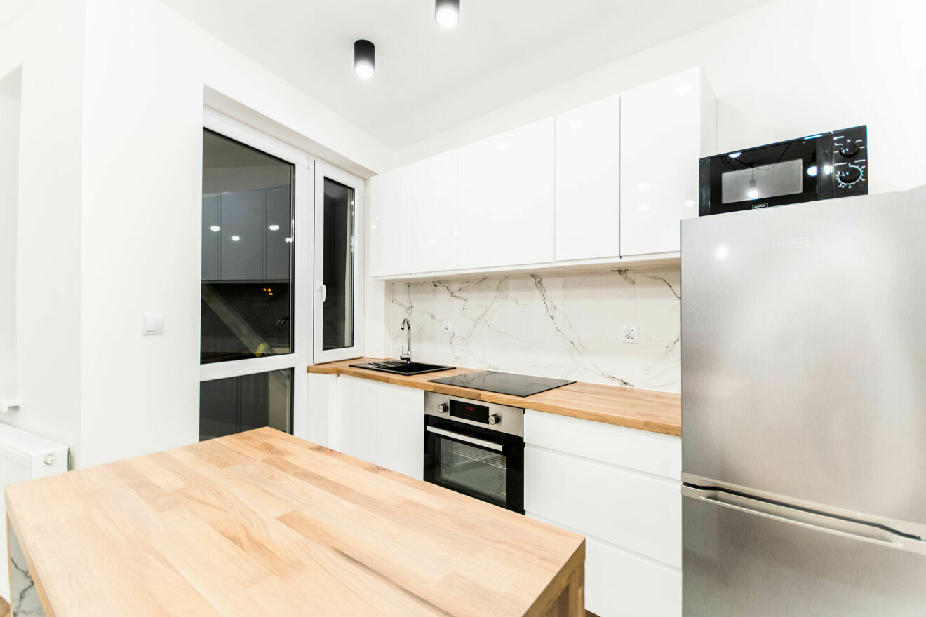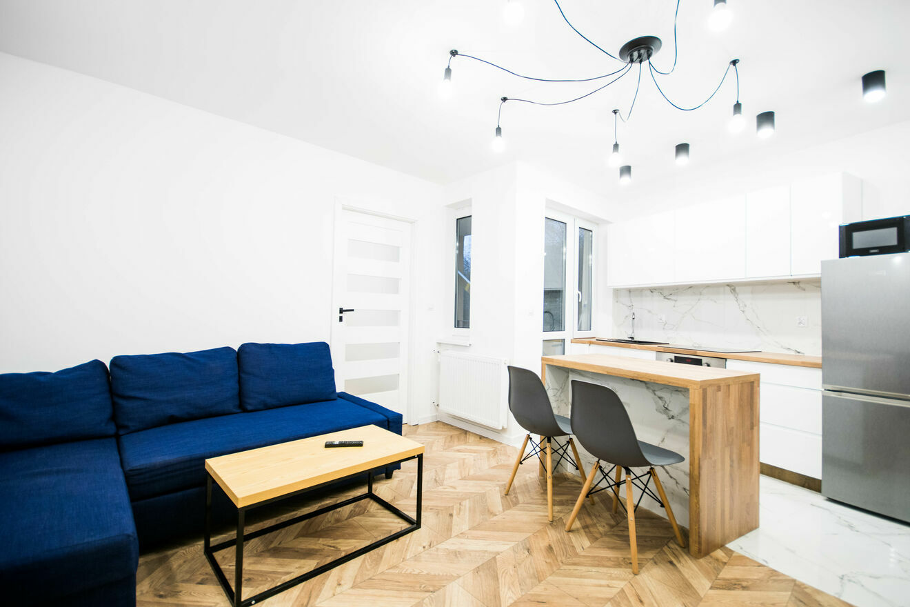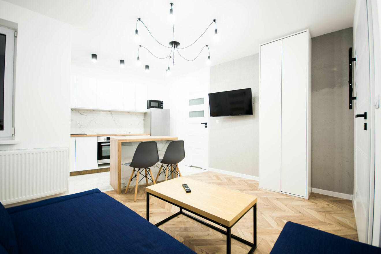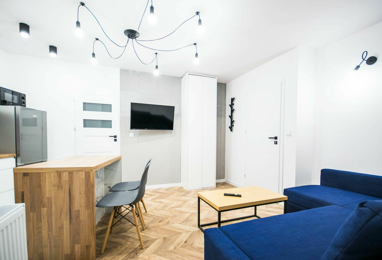 W mieszkaniu znajdziesz nowoczesny salon z częścią wypoczynkową z rozkładaną sofą, stolikiem, telewizorem ze smart TV i szafą. Przestronna kuchnia, w której znajdziesz wszystkie niezbędne sprzęty AGD, takie jak: piekarnik, lodówko-zamrażarka, płyta indukcyjna, mikrofalówka. Sypialnia z wygodnym łóżkiem z przestrzenią do przechowywania. Łazienka z dużym prysznicem, pralką, nowoczesną umywalką i lustrem.