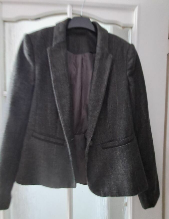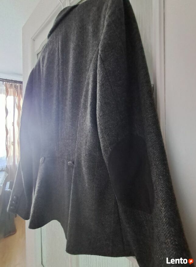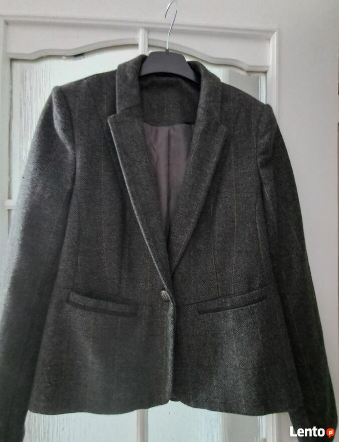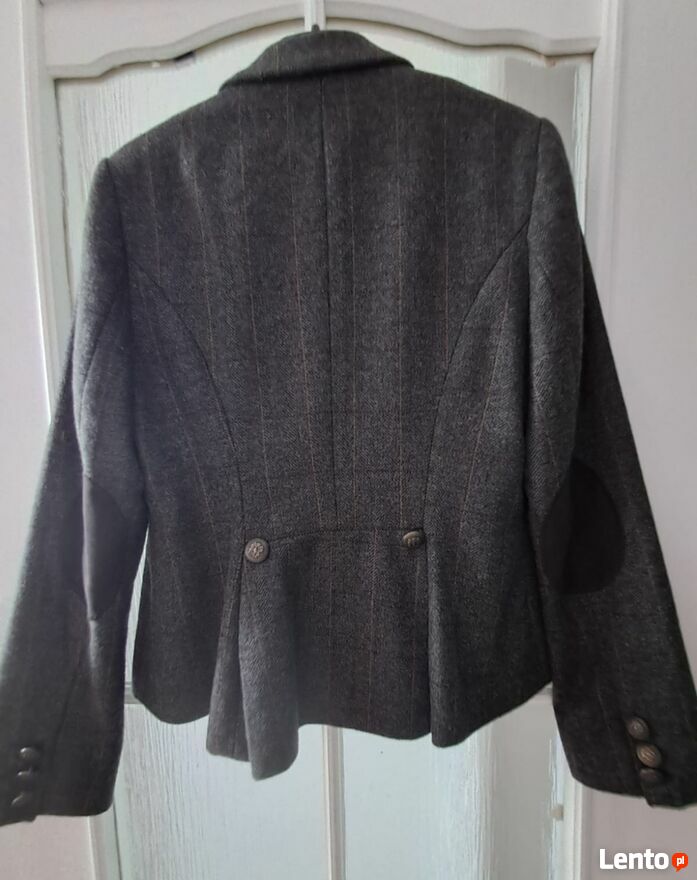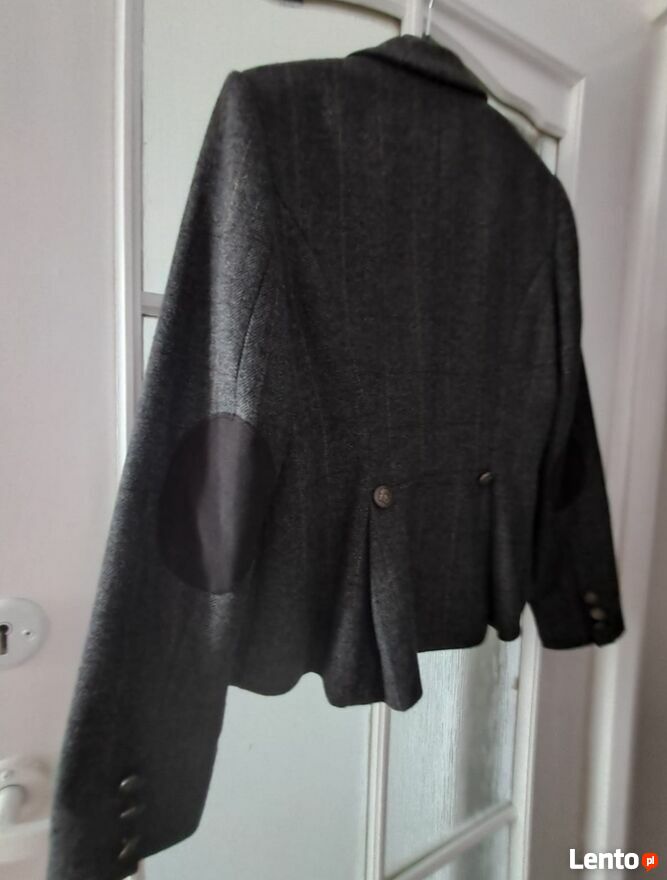 Oryginalny ciemnoszary żakiet z łatkami na rękawach. Z tyłu ozdobny klin, ciekawe guziki, posiada kieszenie. Rozmiar 36/38.Małgorzata